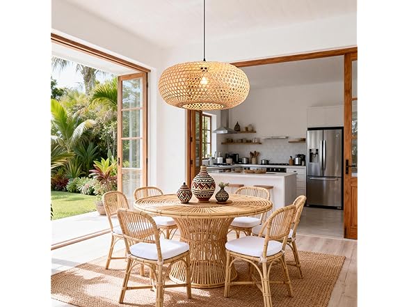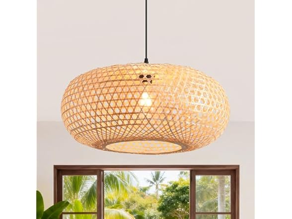 Transform Your Space with Natural Elegance Elevate your home decor with our 21.65" Bamboo Pendant Light, a masterpiece that combines traditional weaving techniques with modern farmhouse aesthetics. Crafted from high-quality natural bamboo strips and a sturdy iron frame, this chandelier is more than just a light fixture—it’s a piece of art that breathes life into any room. Whether you are looking to brighten up a kitchen island, add warmth to a dining room, or create an inviting entryway, this ceiling light delivers. The open-weave design allows for maximum light output while diffusing it into beautiful, intricate patterns that dance across the room. Specifications: Dimensions: Diameter 21.65", Max Height 57.09" Material: Sustainable Bamboo + Matte Black Iron Adjustable Cord: 47.24" Long Bulb Type: 1 x E26 Base (Max 60W, Bulb not included) Weight: Ultra-light 1.12 lbs for safe hanging Perfect for those who love Boho, Coastal, or Rustic styles, this hanging lamp is easy to install and built to last.