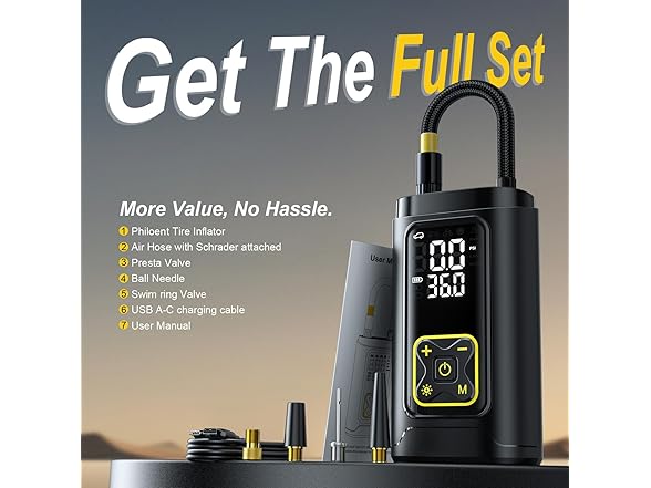 - 🎁【All-in-One Ready Kit, The Perfect Gift】Designed for ultimate peace of mind. It’s the thoughtful gift for women and gifts for men, that keeps your loved ones safe and prepared for any journey, compact enough to store in any glove box. 【Package List】 1* Philoent Tire Inflator, 1* Air Hose with Schrader attached, 1* Presta Adapter, 1* Needle Adapter, , 1* USB A-C Charging Cable, 1* User Manual. For any questions or concerns, please feel free to reach to us.