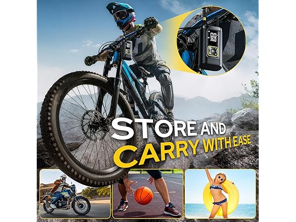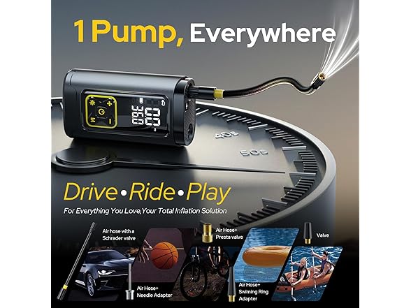 - 💡【5-in-1 Smart Modes for Every Task】Effortlessly tackle all inflation needs. Switch between 5 preset modes (Car, Bike, Motorcycle, Ball, Custom) for optimal performance. The tire inflator portable air compressor includes an air hose with a Schrader valve attachment, plus 4 additional adapters (Presta, Needle) to perfectly fit everything from car tires to sports equipment. Our tire air pump is not intended for large-volume inflatables like air mattresses or paddle boards or heavy load tires