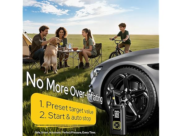 - 🛑【Set It & Forget It: Auto-Stop Safety】Experience truly hands-free operation. Simply preset your desired pressure using the ‘+/-’ buttons on the car tire air pump and connect the hose. With a press of the 'Start’ button, the unit automatically shuts off upon reaching the target, eliminating the risk of over-inflation and ensuring both tire safety and your peace of mind.
