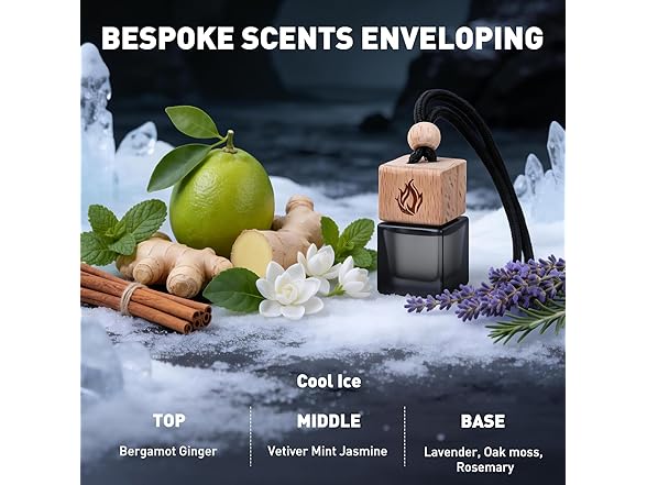 - LAYERED COOL ICE CAR SCENT: Top notes zesty bergamot and spicy ginger for crisp energizing vibes. Heart notes earthy vetiver cooling mint and delicate jasmine for fresh balanced aroma. Base notes calming lavender woody oakmoss and rosemary for soothing long lasting scent. Great for man who crave a non overpowering cool ice fragrance that stands out from ordinary car air fresheners.