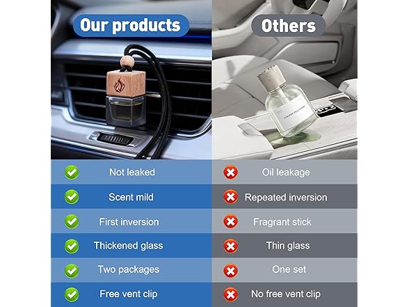 - EASY TO INSTALL: Hanging/Vent Clip 2-in-1 design. Hang the car scent on your rearview mirror, it’s lightweight, compact, won’t block your line of sight. Or clip it to car vents, spreads fragrance evenly. Installs in 2 seconds, no tools, no messy sprays, no sticky residues.