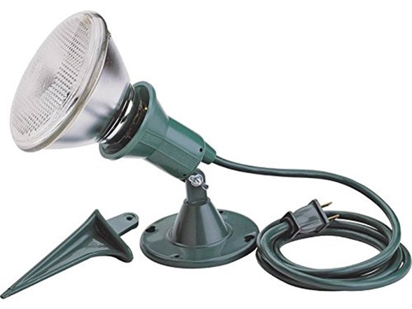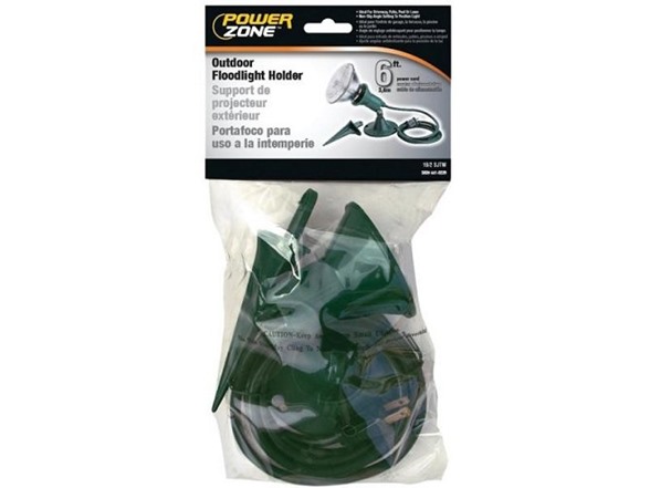 Outdoor floodlight holder with 6 foot power cord. Durable and weather resistant construction. Ideal for landscape, landscape, driveway, pool, lawn, and holiday lighting. Green with 18/2 SJTW gauge cord and ground stake with non-slip adjustable angle setting for the light. 150 watts 125 volt max. Mounting screws included. Culus listed. Bulb not included.