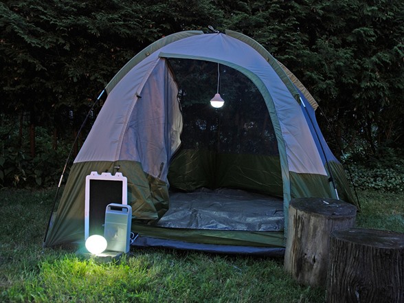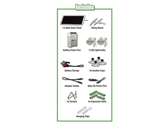 - Kit includes, solar panel, rechargeable battery pack, and two LED powered lights.