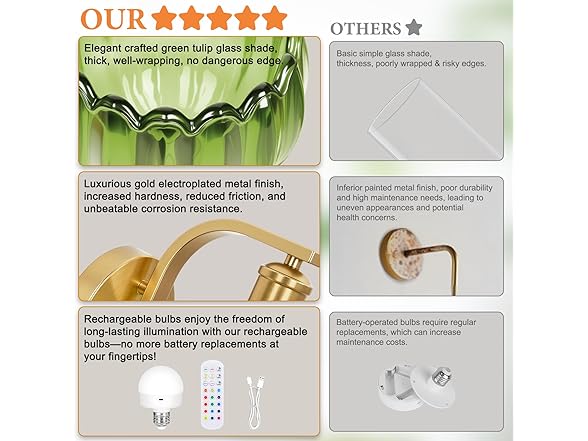 - 2025 Upgraded Durable Battery Powered Wall Sconce: Built with thick, stable and safe tulip-shaped glass lampshade with real polished brass back plate which is durable and rust-proof, our stylish battery wall sconce is not only make your friends' eyes light up when they come to your home, but also can be used for years. Perfect for your wall decor in any space, so just enjoy a warm glow without worrying about breakage or peeling paint!