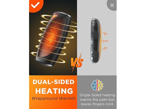 - 360° WARMTH FEEL THE HEAT ON BOTH SIDES. Why settle for half-warm hands? Unlike flat, single-sided warmers, VIMWING dual-sided heating design provides a cozy, all-around warmth that melts away the chill from both your palms and knuckles in seconds.