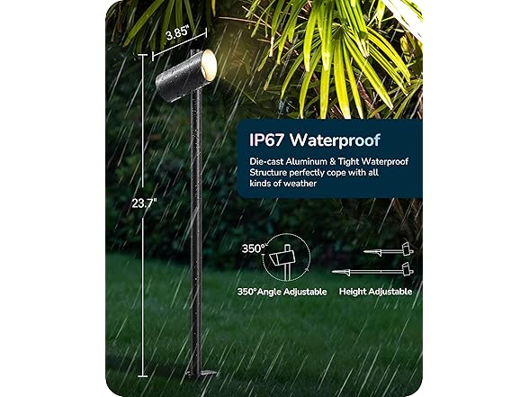 - 【Waterproof & Durable】Made of heavy-duty aluminum material, IP67 water resistant and anti-corrosion, these landscape path lights can hold up nicely through harsh weather conditions from -40℉ to 140℉ and last for years; ground stake supplied is sturdy enough to wedge into the ground easily without bending even in dry hard soil