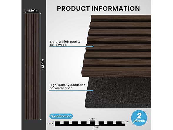 ROOMTEC 2 Pack Acoustic Solid Wood Wall Panels, 94.49” x 12.6” Soundproof Wall Panels, Wood Slat Wall Panels for Wall Decor (Smoking Walnut)