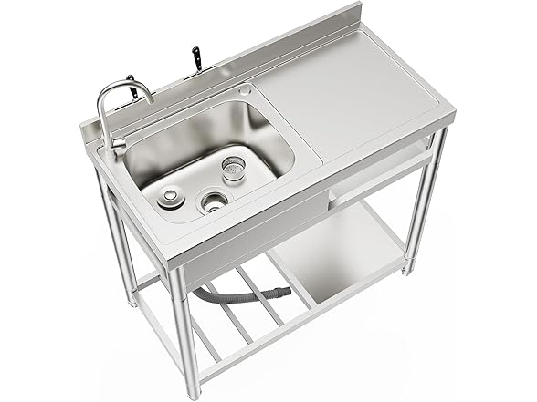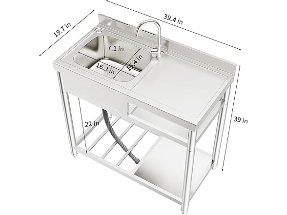 - Ideal Size Stainless Steel Sink Set: The sink set stands at a height of 35.4 inches, with a top size of 39.3"L x 19.7"W. The bowl measures 17.7"L x 13.5"W and is 7.5" deep. Crafted from high-grade, robust stainless steel, it is incredibly easy to clean and maintain a hygienic state. The polished surface offers superior anti-corrosion effects and durability, lending a glossy, shiny appearance. The spacious drainer gives you ample room to dry everything, from cutlery and plates to pots and pans.