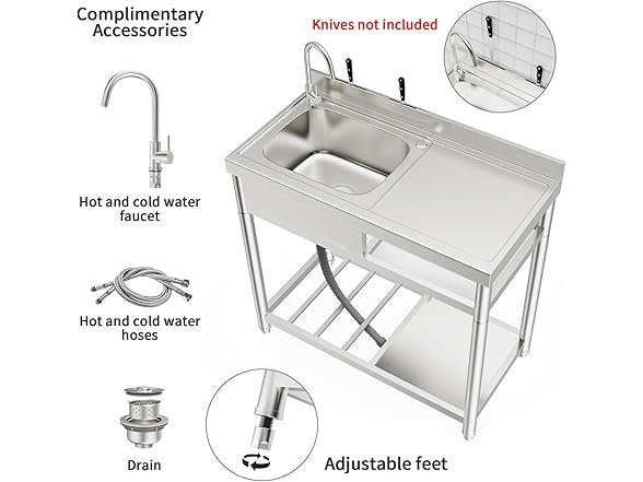 - Preparation & Utility Sink Set: The double shelves provide storage for cleaning equipment and accessories. The basin incorporates stainless steel drainage devices with removable filters to prevent food and debris from clogging the drain. It is equipped with adjustable bullet feet for stability on uneven floors The reinforced table is ideal for cutting pork chops, steaks, and more. The sink set includes a gooseneck faucet with 360-degree rotation for convenience and two kitchen knife holders.
