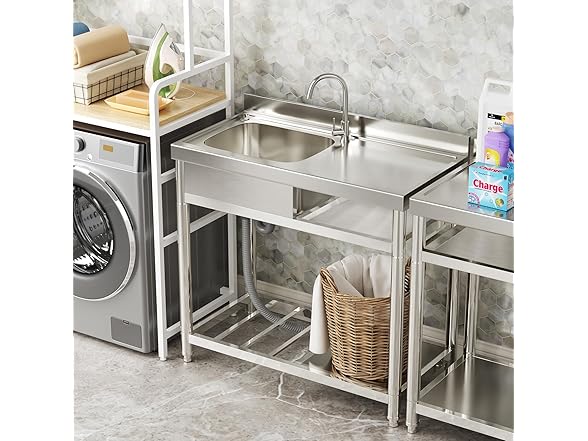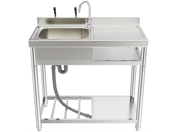 - Functional Free Standing Commercial Kitchen Sink: This ROOMTEC single bowl freestanding commercial kitchen sink with faucet fits seamlessly into any dining context. Equipped with a hand basin, ample drainage, and storage shelves, it optimizes efficiency in the kitchen, laundry room, utility room, or garden.