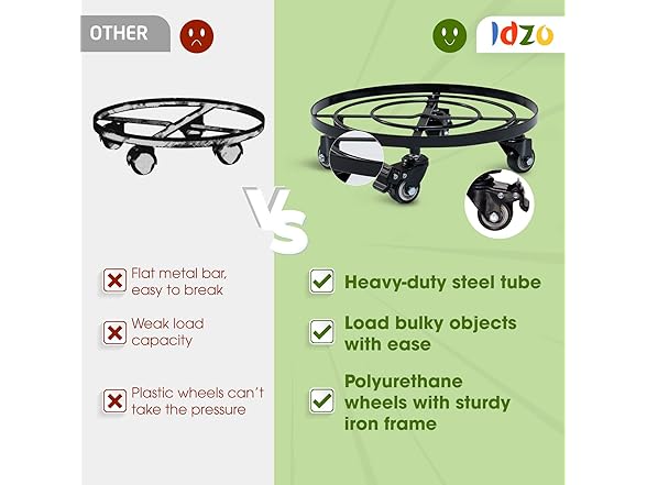 - HEAVY DUTY STEEL PLANT CADDY LOAD UP TO 180 POUNDS: The plant stand with wheels is welded with solid, high tolerance steel that can load up 180 pounds of heavy plant pots or other heavy household items with ease, With IDZO caddy, hauling heavy items will no longer be your pet peeve