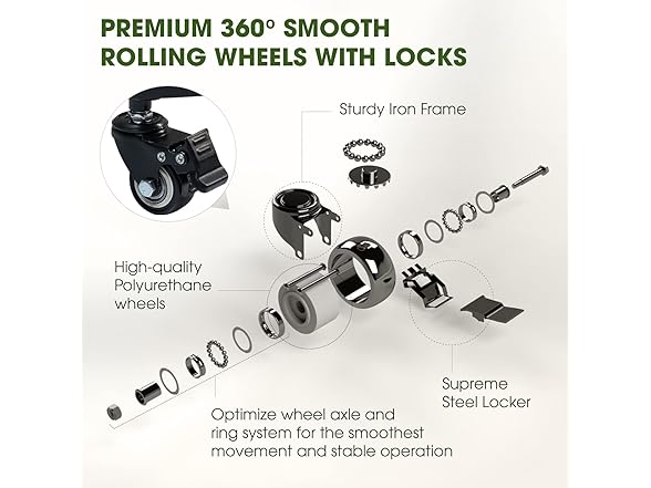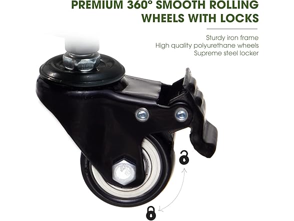 - PREMIUM 360 DEGREES SMOOTH ROLLING WHEELS WITH LOCKS: 360 degrees rotation Polyurethane wheels are resilient, flexible, and durable; Smoothly rolls on any surface such as carpet, soil ground and lawn without being stuck or locked up; Locking wheels allow you to lock the caddy in place and prevent sliding