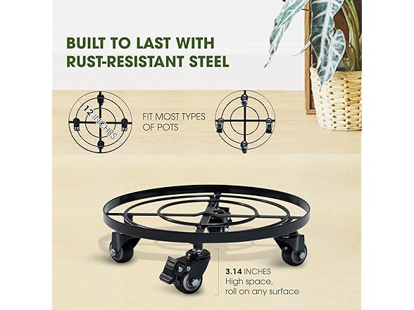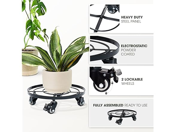 - ELECTROSTATIC SPRAY POWDER COATED: The rustproof, water resilient, and weather resistant matte coated makes the rolling plant stand more durable under any prolonged exposure to harsh environmental conditions; Our rolling plant caddy also reduces waste due to the modern electrostatic spraying technology