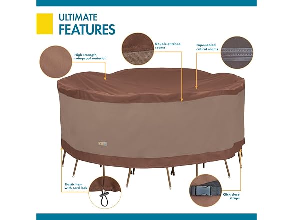 Ideal for harsh weather and high wind conditions, Ultimate covers are designed to protect patio furniture from dust, dirt, sun, rain, and heavy snow. These waterproof covers are made with sealed seams to prevent leaks while breathable side panels help reduce condensation. We added thoughtful details, like a polyester base for added durability and a mocha cappuccino color that complements any space. And with a two-year warranty, even your covers are covered.