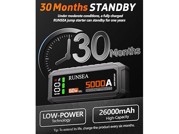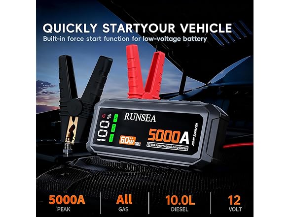 - The D28 Jump Starter, packing a 26000mAh battery and 5000A peak current, is your go-to emergency solution for 12V vehicles. Whether it’s your car, truck, boat, or other larger rides, it quickly jumps back to life dead battery in a pinch. Built to handle gas 7L and diesel engines up to 6.5L, it’s the reliable wolfpack of power you need when your vehicle leaves you stranded