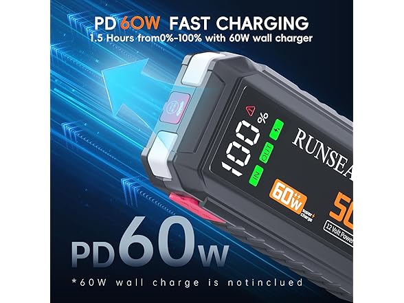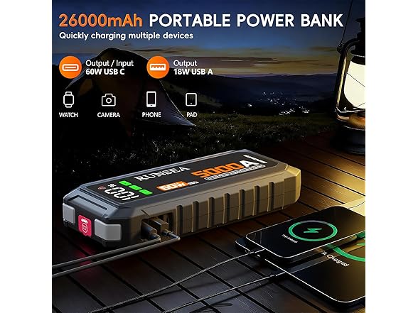 - FAST CHARGING POWER BANK-Comes with a 60W USB-C port (input and output) and two QC3.0 USB-A ports. Phones, laptops, iPads... whatever device you have, it charges a phone 80% in 30 minutes — way quicker than regular power banks!Take it on trips or camping: this jump box gets all your devices fully charged in no time. No more rushing to find a socket or waiting ages for a charge.