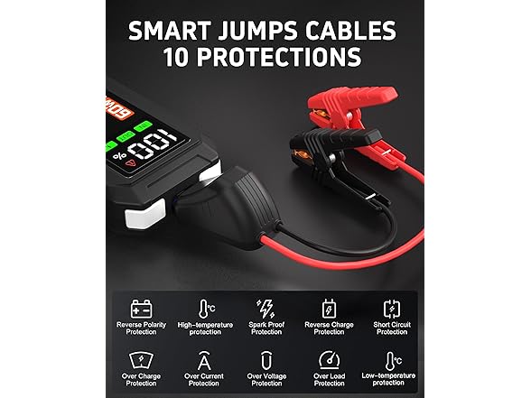 - SIMPLE & FOOLPROOF OPERATION-Equipped with safety features to avoid mistakes, this jump starter prevents overcharging or short circuits.You can confidently start your car every time without worrying about incorrect connections even with no technical experience