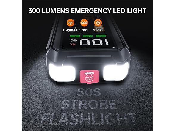 - Hit the one-touch button to jump-start low-voltage vehicles in a snap. The built-in LED flashlight has high-beam, strobe, and SOS modes—your go-to emergency tool for any situation.