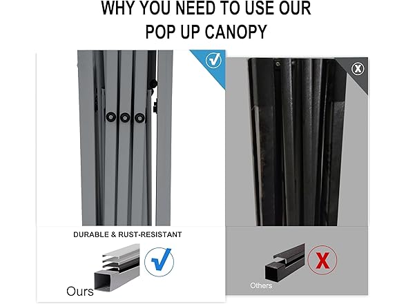 - DURABLE, RUST-RESISTANT FRAME: Canopy metal legs are of 28x28 mm, and the top bracket is made of 12x24 mm metal. The frame is made of powder-coated steel with an eco-friendly anti-rust coating, ensuring long-lasting performance in various weather conditions. The sturdy, high-grade and heavy-duty frame is designed to support up to 120 lbs, with protective foot pads and included 4 sandbags to secure canopy on windy days.