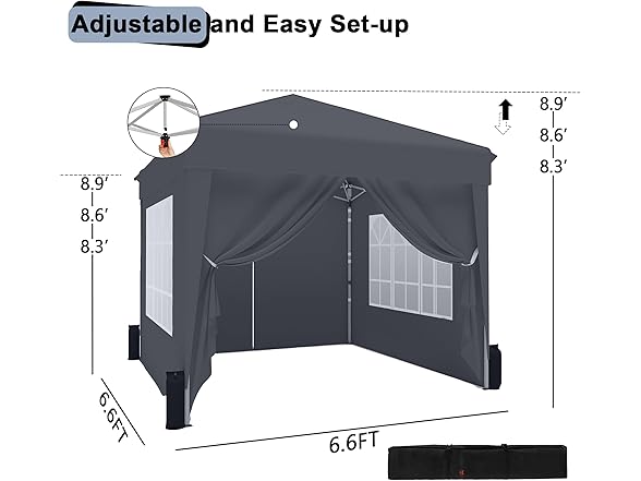 - SPACIOUS AND COMPACT: The 6.6 x 6.6 FT canopy Offers 43.56 sq. ft. of shade for up to 6 people with over 9 ft peak height; no overhead crossbars allow more headroom; Heavy-duty rolling bag with sturdy handles allows effortless portability and storage, perfect for extended outdoors use at markets, festivals, and exhibitions.
