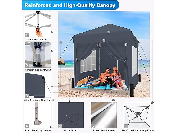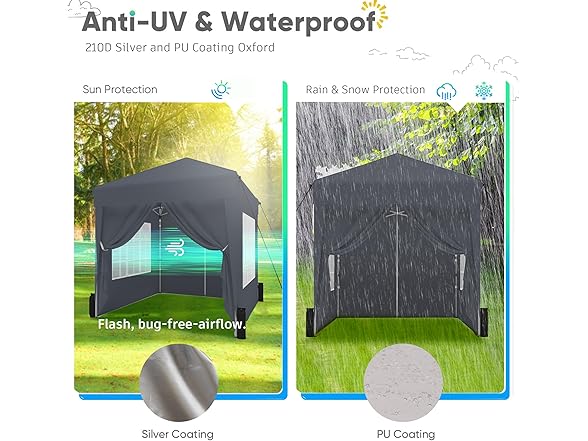 - Waterproof & UV Protection Portable Canopy Tent: The 6.6' x 6.6' canopy made with durable 210 D Oxford polyester fabric. The silver-coated top fabric not only ensures waterproof protection but also blocks 99% of harmful UV rays, providing excellent sun protection with a UPF 50+ UV protection, ensuring cooler and safer shade for your outdoor events and gatherings.