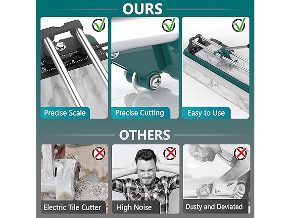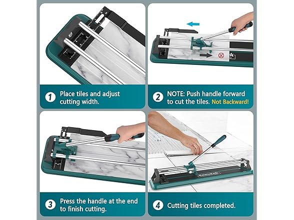 - ✅ Precise and Smooth Cutting: The tile cutter is equipped with a tungsten carbide cutting wheel, which is hard and durable. Pull the handle to the end, lay the tile, push the handle forward to cut, and press on the end to complete the cut. No dust and no noise during tile cutting, in comparison to an electric tile cutter, the manual tile cutter provides a quieter and cleaner cutting experience.