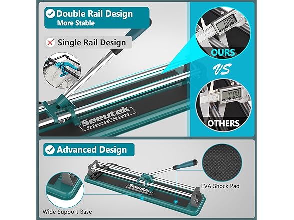 - ✅ Double Rails Design - The dual rails provide increased stability during the cutting process, achieving more precise and accurate cuts, and reducing the chances of errors or uneven edges on the tiles. The handle of the tile cutter is designed ergonomically with a curved shape. This design ensures a more comfortable grip and reduces strain or fatigue on your hand and arm during operation.