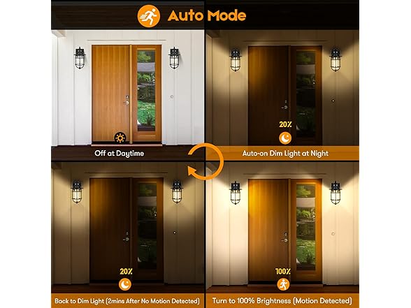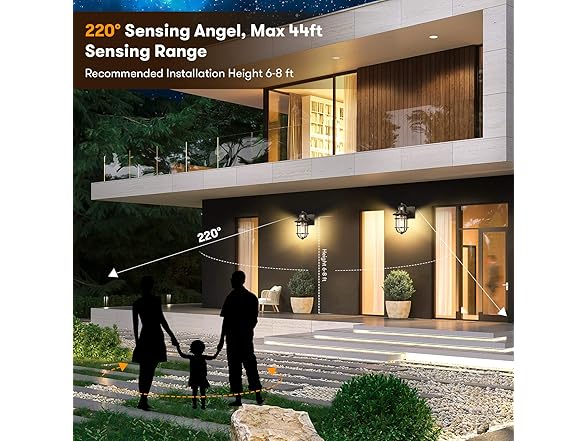 - 【Upgrade Motion Activated & Dusk to Dawn Sensor】Combining the advanced PIR motion technology & IC light sensor, this motion sensor outdoor wall lantern is an good choice for you. This wall lantern will turn on at dusk with 25% brightness, switch to 100% brightness when motion detected, revert to 25% brightness after 2mins without movement, and will auto off at dawn. Moreover, with a sensing range of 220 degree and Max 40 feet, this wall light delivers more convenience to your life.