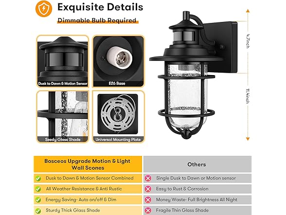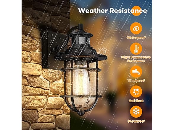 - 【High Quality Materials Made, Waterproof & Durable】Unlike other wall sconce made of plastic or poor-quality iron which is easy to crack or get rustic, our dusk to dawn wall lantern is 100% heavy-duty sturdy metal made. Combining with well-rubbed black matte finish and sturdy seedy glass shade, this exterior wall sconce is waterproof, anti-rustic, durable and weather resistant, suits in any outdoor environment and for long term use. Perfect for patio, doorway, porch, yard, garage, etc.