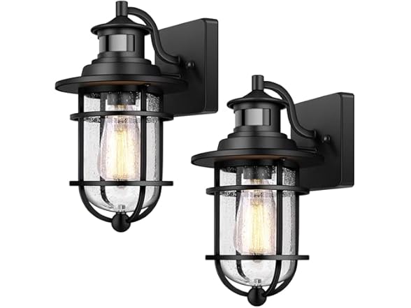 In the Box: (1) Set of 2 Motion Sensor Outdoor Wall Lantern Dusk to Dawn Waterproof Exterior Wall Sconce With Seeded Glass Black Wall Mount Light Fixture for Porch Doorway Garage, E26 Socket, Motion Activated