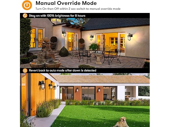 - 【Switchable 2 Lighting Mode, More Choice, Better Life】Unlike other traditional wall sconces that only have single lighting mode, besides the auto on/off function, this dusk to dawn wall light fixture also includes an excellent function: Manual Override Mode. Just simply turn on then off the wall switch within 2 secs, you will get a full brightness that lasts for 8 hours, if needed. Note: It will automatically revert back to auto mode after dawn is detected.