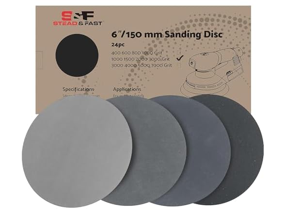 PRODUCT OVERVIEW The S&F STEAD & FAST 6 in Sanding Discs Velcro Assortment Pack is perfect for your cutting, sanding, grinding and polishing needs. 3 different bundles consist of: 6 x 400 grit wet dry sandpaper, diameter 6 inches 150 mm 6 x 600 grit sand paper, diameter 6 inches 150 mm 6 x 800 grit sanding paper, diameter 6 inches 150 mm 6 x 1000 grit sand paper, diameter 6 inches 150 mm 6 x 1000 grit wet dry sandpaper, diameter 6 inches 150 mm 6 x 1500 grit sand paper, diameter 6 inches 150 mm 6 x 2000 grit sanding paper, diameter 6 inches 150 mm 6 x 3000 grit sand paper, diameter 6 inches 150 mm 10 x 3000 grit wet dry sandpaper, diameter 6 inches 150 mm 6 x 4000 grit sand paper, diameter 6 inches 150 mm 6 x 5000 grit sanding paper, diameter 6 inches 150 mm 2 x 7000 grit sand paper, diameter 6 inches 150 mm PRODUCT BENEFITS Achieve the desired smooth finish with a wide variety of grits from medium fine 400 grit to ultra fine 7000 grit. Work through the grits! All 6’ round sandpaper discs are attached to and removed from sanding pads with the robust velcro backing Grit clearly marked on the back of each DA sander paper. We stand by the quality of our products. Should any of them be defective, you will have the choice of a refund or a replacement.