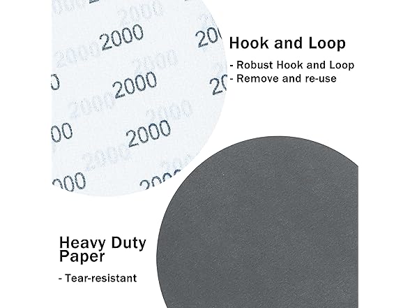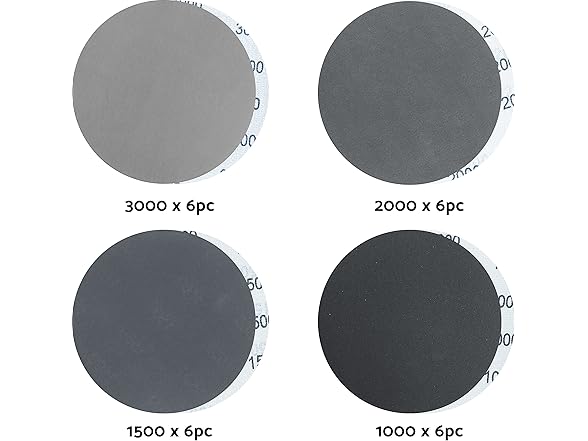 - 6 sanding discs hook and loop: 6 pcs of 1000 grit hook and loop sandpaper, 6 pcs of 1500 grit sandpaper, 6 pcs of 2000 grit sandpaper, 6 pcs of 3000 grit wet sandpaper.