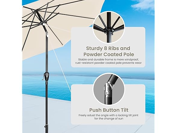 - Sturdy frame structure: Our outdoor patio umbrella is made of rust-free steel with 8 heel stainless steel heavy-duty ribbed brackets, which make it perform better in wind and rust resistance and make the umbrella durable