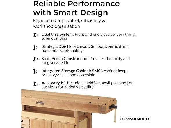 - Versatile Workholding Design: Strategically placed 3/4" bench dog holes on the top, legs, and dual vises provide secure clamping for materials of various shapes and sizes, making this bench ideal for precision tasks