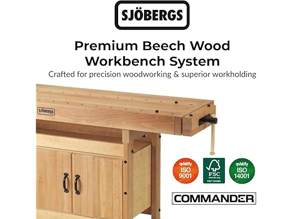The Sjobergs Scandi Plus workbenches are the perfect bench for the discerning woodworker. The top is made of full length beech laminations without end splices. Top thickness is a full 1-1/2 In. in the center with a 4-5/16 In. skirt for excellent stability. Two rows of bench dog holes extending from each vise for excellent clamping capabilities. Bench dog holes can also be found in the beech trestle. Four 3/4 In. bench dogs with side springs are included. The two vises feature 4.5 In. max capacity. SM03 cabinet is constructed of solid hardwood and hardwood veneers with 3 draws and two doors for great storage capacity. Accessory kit includes ST11 hold down, universal anvil and one set of jaw cushions. European beech 70.1 In. x 22.8 In. work top, 1.5 In. top thickness with 4.3 In. skirt 4.5 In. vise capacity 35.5 In. work height Includes 4 bench dogs Cabinet: 41 In. x 16.125 In. Accessory kit includes universal anvil, jaw cushions, and Holdfast.