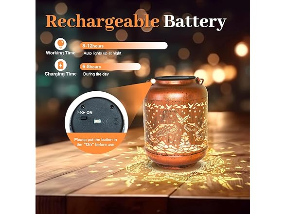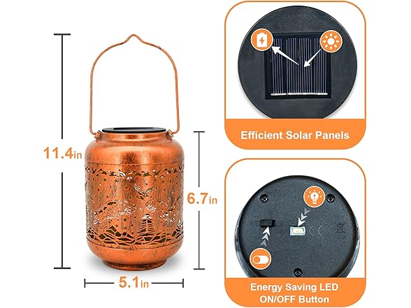 - 【Efficient solar power】This hanging solar lantern is equipped with an upgraded high-efficiency solar panel, and the LED light source is more stable. No power cord is required, easy to use. Collect sunlight to charge the battery for 6 hours during the day, and it can work continuously for at least 8 hours at night. Note: Make sure the button is in the "on" position, and the light will light up when the solar panel is in the dark (after charging).