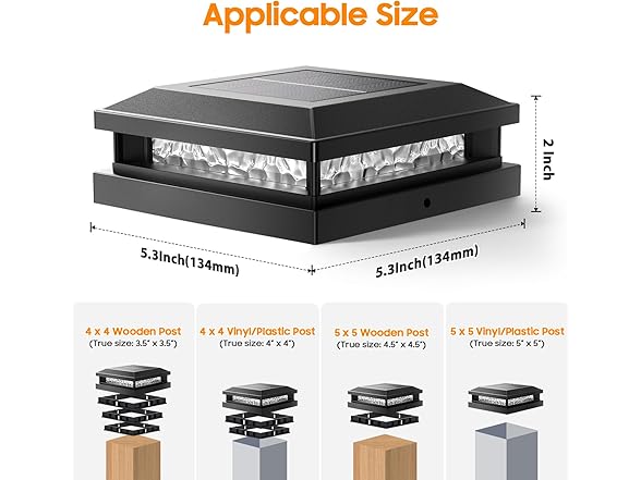- 【Match Various Size Post & Easy to Use】Equipped with 4 different base, these solar fence lights can fit various post size of 4x4 and 5x5, whether it is wooden, vinyl or plastic. Choose the appropriate base size and place it on the corresponding post, then screw the two screws into the post through the small holes on both sides of the base. If you have any confuse about the product or looking for help, please don’t be hesitated to contact us. (True size: 3.5"x3.5", 4"x4", 4.5"x4.5", 5"x5")