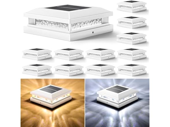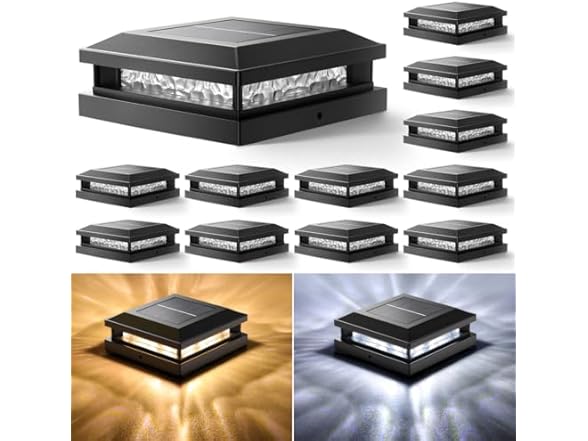 In the Box: (1) Solar Post Cap Lights 12 Pack, Upgraded Outdoor Fence Post Lights for 4x4 4.5x4.5 5x5 Vinyl/Wood Posts, Deck Posts Cap Light Solar Powered with Warm White/Cool White -Choose Color