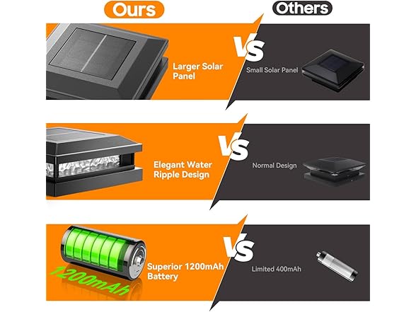 - 【Solar Powered, Wireless & Cost Saving】Featuring a larger polysilicon solar panel and the 30% faster charging conversion rate, these solar post lights achieving a full charge in 6-8 hours under direct sunlight. Unlike those other lights with only 600mAh, the 1000 mAh large capacity battery of our post cap lights ensuring a continuous up to 10-12 hours. Individual solar powered design save you away from wiring hassles and soaring electricity bills. Ideal lighting choice for outdoor space!