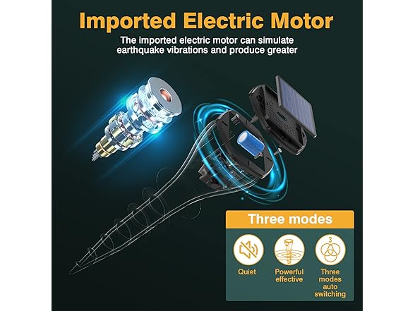 - How it Works: Utilizing various ultrasonic frequencies and vibrations, the device effectively repels moles and other lawn-damaging animals. It offers three modes: alert, rapid, and symphony, featuring a dynamic vibrating pattern to prevent habituation.