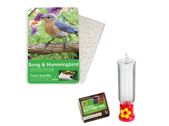 Bring your garden, walkway, or outdoor living area to life with this easy to use roll out flower seed mat. Specially designed with a blend of beautiful flowers made to attract hummingbirds and songbirds. These pre-seeded flower mats are produced right here in the United States, are made of 100% recycled paper and include over 10g of specially chosen wildflowers. All you have to do is lay out your mat, cover with the included potting soil, and water! It is that easy to have the garden and flowers of your dreams. Includes a 2oz hummingbird feeder. Mix with your favorite nectar or hummingbird food and enjoy.