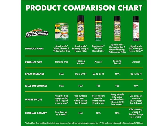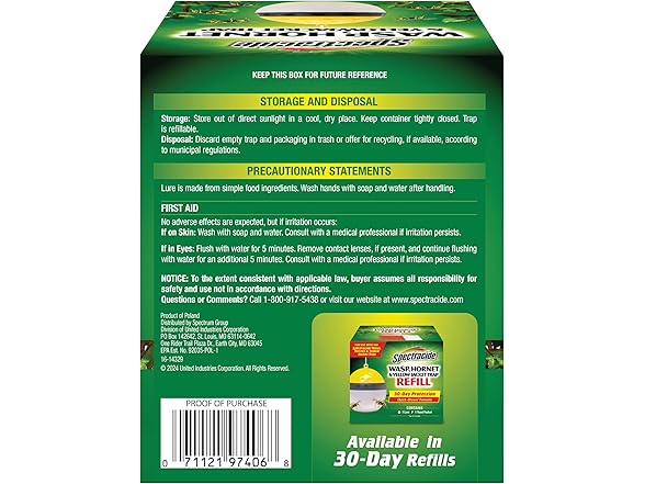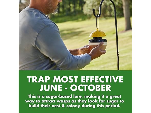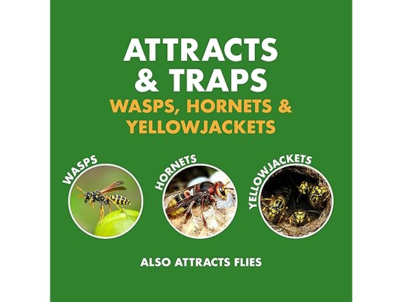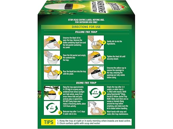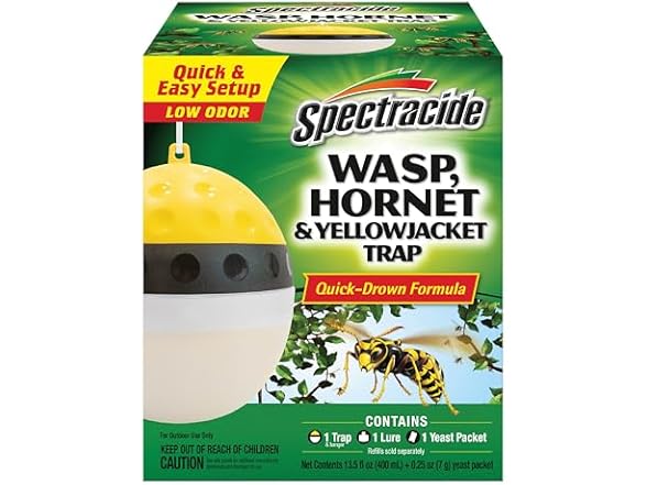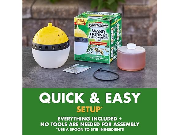 Spectracide™ Wasp, Hornet, & Yellowjacket Trap contains a food-based lure with a quick-drown formula that starts working immediately to attract and trap listed outdoor pests. Once neutralized, the pests can be disposed of securely without escape. Spectracide™ Wasp, Hornet, & Yellowjacket Trap attracts outdoor pests such as wasps, hornets and yellowjackets. This sugar-based lure is made with simple food ingredients and each lure lasts up to 30 days. June – October is the best and most effective time to use this trap, as wasps look for sugar to build their nests and colony during this period. Refills available for purchase separately. Spectracide™ Wasp, Hornet, & Yellowjacket Trap requires no tools for assembly, making it quick and easy to set up. Once assembled, hang the trap approximately 4-5 ft high in a sunny area, sheltered from direct sunlight and high winds, away from areas where kids and pets actively play or spend time. Hang traps 15 ft from pest activity (if using multiple traps, place 15-30 ft apart). Do not hang traps near nests or flowering plants. Always read the entire label and follow all directions and precautions.