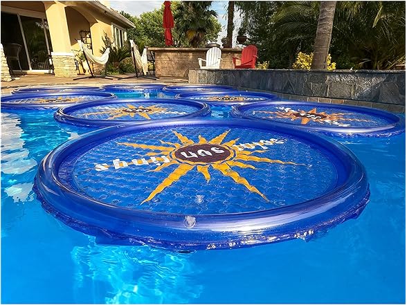 The Solar Sun Ring - Sunburst is a passive solar swimming pool heating device made from two sheets of heavyweight U.V. resistant vinyl. The upper clear layer holds insulating air and focuses sunlight on the blue colored lower layer. The blue layer absorbs about 50% of the sunlight and converts it to heat. The balance of the sunlight is allowed to pass through for deep water heating.