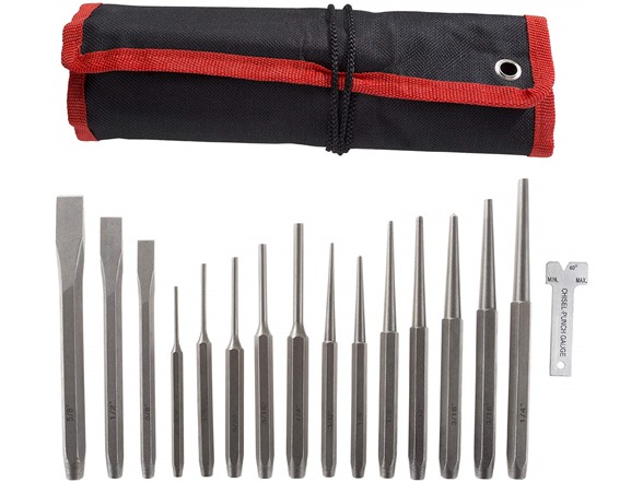- SET INCLUDES- The 16-piece set consists of 5 taper punches; 3/32”x5 1/4”, 1/8”x 5 ¾”, 5/32”x6”,3/16”x 6 ¼”,1/4”x 6 ¾”. 3 Cold chisels:3/8”x 5 ½”, 1/2”x 6”, 5/8”x 6 ½”. 5 Pin punches; 3/32”x 4 ¼”, 1/8”x 4 ¾”, 5/32”x 5”, 3/16”x 5 ¼”, ¼”x 5 ¾”. 2 Center punches;1/8”x5”, 3/16”x 6” and 1 chisel gauge. Hardness 54~58 HRC.