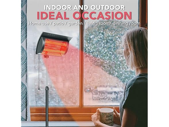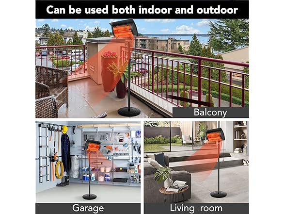 - OUTDOOR & INDOOR USE: Simple Deluxe Electric Patio Heater is suitable for outdoor and indoor use. The Simple Deluxe Electric Patio Heater has 2 heat settings (750W/1500W)to meet your needs. High heat setting is more suitable for outdoor porches, balcony, and backyards. While low heat is ideal for indoors. Just place it anywhere you want and enjoy the warmth.