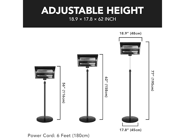 - SCALABLE AND POWERFUL: The extension range of the heater's telescopic rod is between 56" and 77".With a 6ft long extension cord, you can expand and contract to reach your ideal height in different scenes and spaces.
