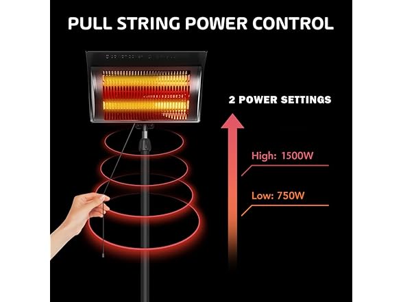 Simple Deluxe Electric Patio Heater – your ticket to instant warmth and comfort, whether you're outdoors on a chilly evening or cozied up indoors. Thanks to its cutting-edge infrared electric fast heating technology, this heater delivers rapid warmth within a mere 3 seconds of activation. The magic of infrared means that the heat is transferred directly to you and the surrounding surfaces, enhancing blood circulation and boosting metabolism. Safety is a top priority with our heater. It's equipped with an advanced flame-out safety protection system, ensuring that when it reaches a certain temperature threshold, it automatically shuts down to prevent accidents, providing peace of mind for you and your loved ones. Versatility is key, and the Simple Deluxe Electric Patio Heater doesn't disappoint. Its telescopic rod extends from 56" to 77", and with the included 6ft long extension cord, you can effortlessly adjust its height to suit various settings and spaces. Whether you're lounging on your outdoor porch, balcony, or backyard, or seeking indoor coziness, this heater has you covered. With two heat settings (750W/1500W), you can tailor the warmth to your specific needs. The high heat setting is perfect for open-air environments, while the low heat setting creates an inviting ambiance indoors. Simply place it wherever you desire and bask in the soothing warmth. To make installation a breeze, our manual provides step-by-step instructions for the bracket. If you ever find yourself puzzled during setup, rest assured that guidance is readily available on the product page. With the Simple Deluxe Electric Patio Heater, instant comfort and satisfaction are just a switch away.