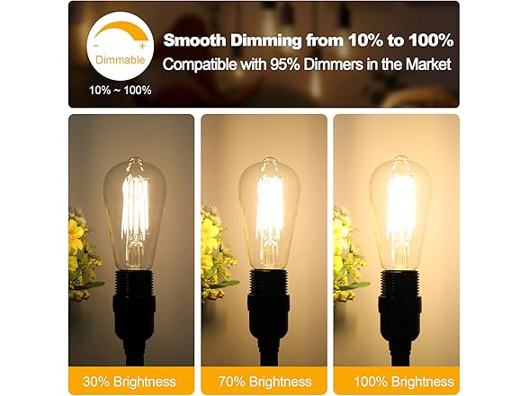 - Upgraded Dimmable Function: Designed with smooth dimming capacity, our vintage LED Edison bulbs offer brightness levels from 10% to 100%, allowing you to create the right amount of illumination for different occasions. They are compatible with most dimmer switches in the US market. Recommended dimmer models are listed below in product description for reference